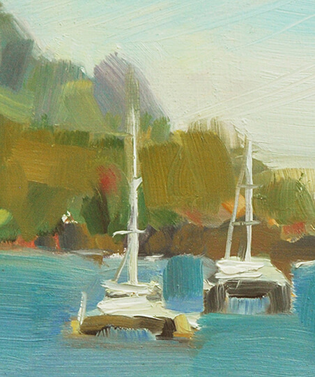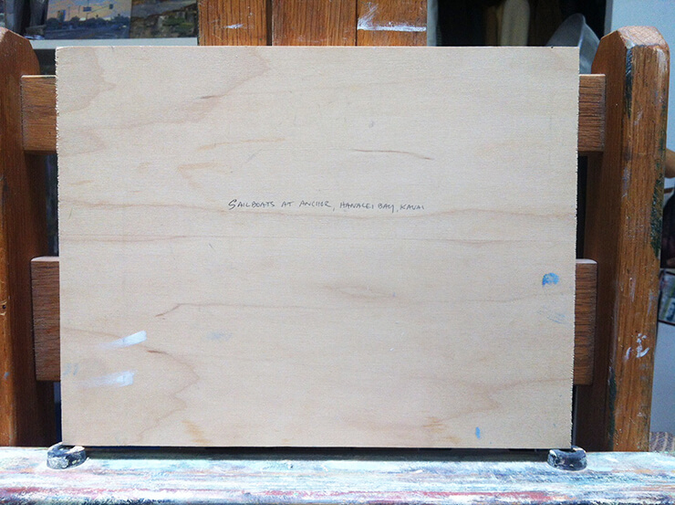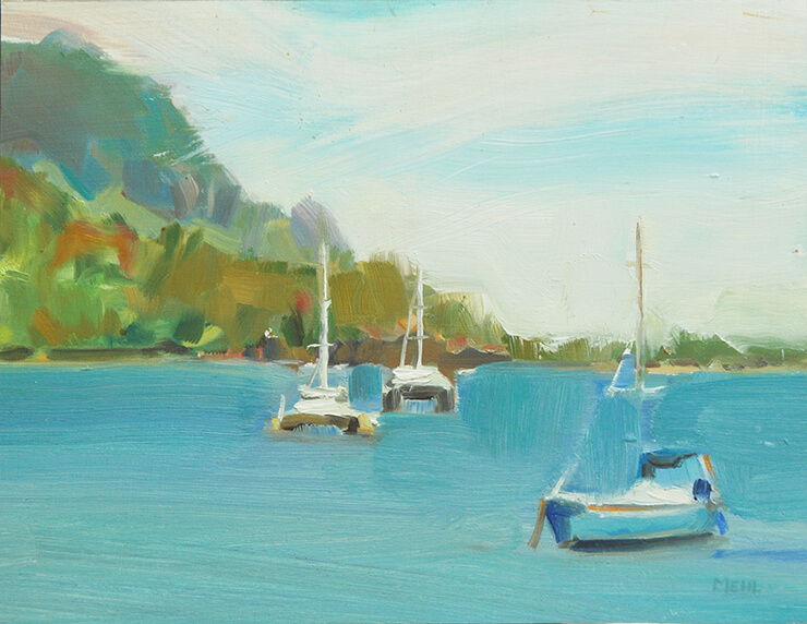 “Sailboats at Anchor, Hanalei, Kauai” Oil on Panel 7 x 9